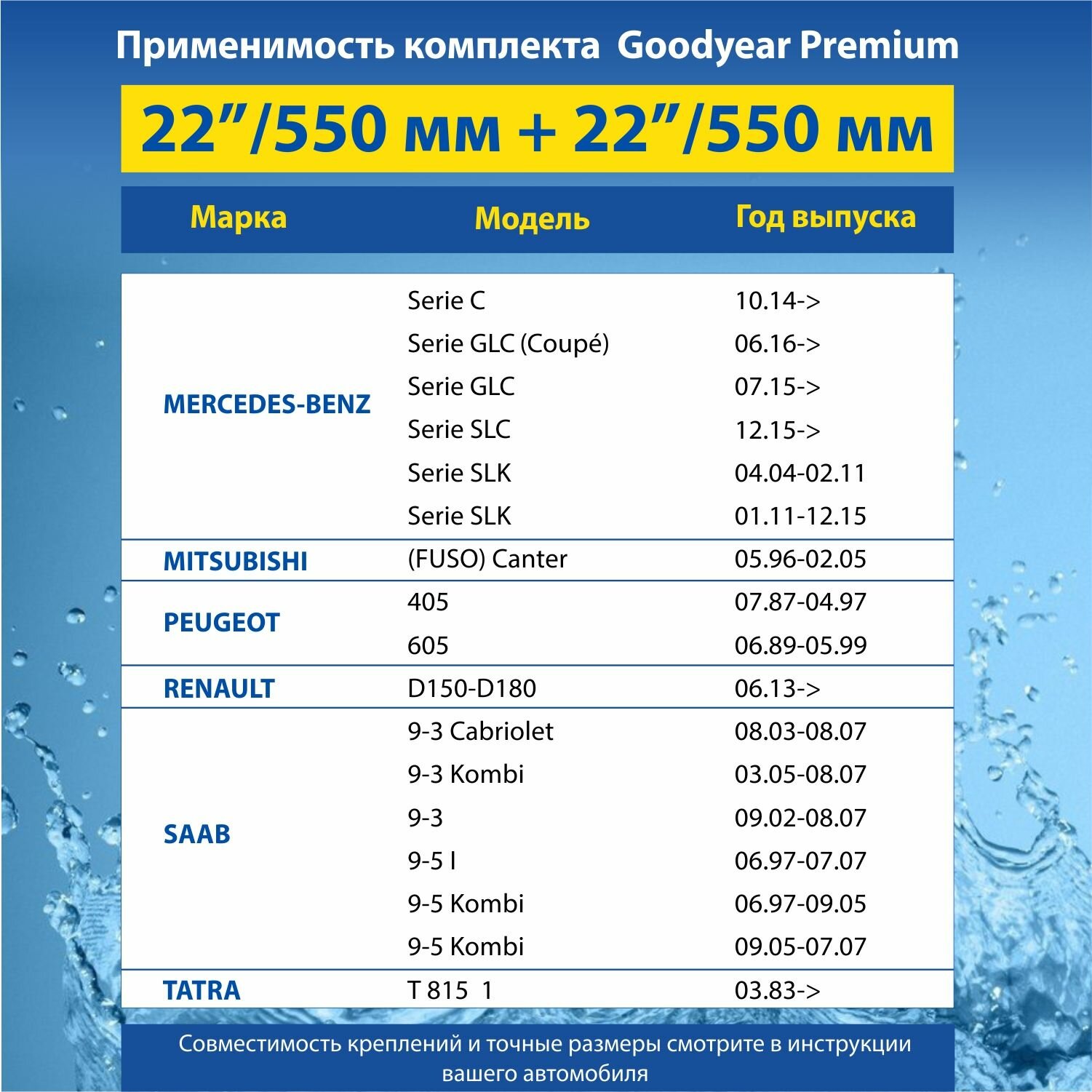 2 Щетки стеклоочистителя в комплекте (55+55 см), Дворники для автомобиля GOODYEAR для MERCEDES-BENZ Serie C, Serie SLK; CHRYSLER 300C; CHEVROLET Tahoe 6 информация: