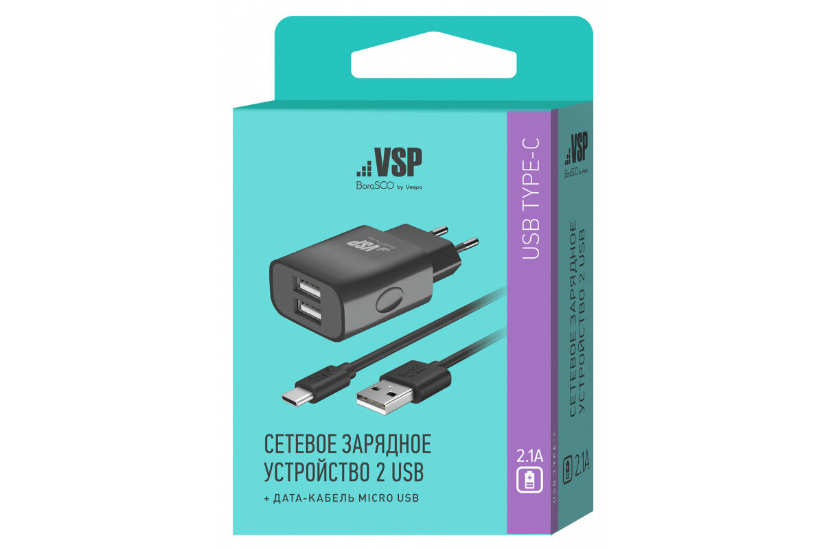 СЗУ адаптер 2 USB 2.1A + Дата-кабель Type-C 2А (100 см) черный, BoraSCO информация: