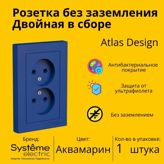 Розетка электрическая двухместная Systeme Electric Atlas Design без заземления в сборе 16А, Аквамарин ATN001120 - 5 шт. 3 703 ₽