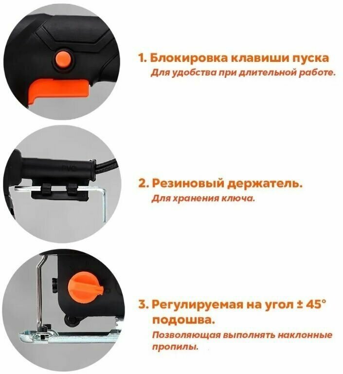 | Особенности конструкции | быстрозажимное крепление пилки / возможность подключения пылесоса / сдув опилок / поворотное основание/рабочий стол |
