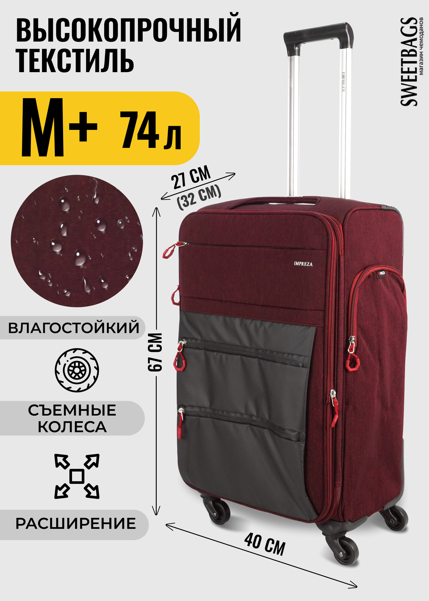 Чемодан Sweetbags текстильный средний с 4 съемными колесами и расширением (waterproof) бордовый M+ информация: