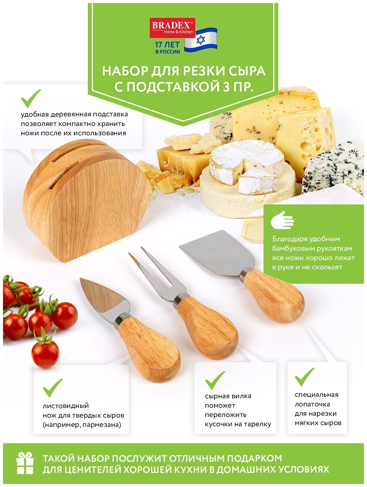 | Дополнительная информация | В комплекте: Нож 1шт, лопатка 1шт, сырная вилка 1шт, подставка 1шт |