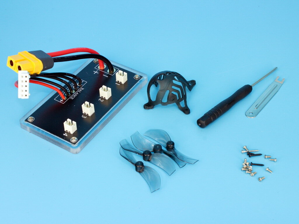 | Комплектация | Собранный FPV квадрокоптер Mobula7 с приемником ELRS 2.4 G; Плата параллельной зарядки 1S аккумуляторов; Комплект запасных пропеллеров и колпак; Отвертка и съемник пропеллеров; Комплект крепежных винтов |