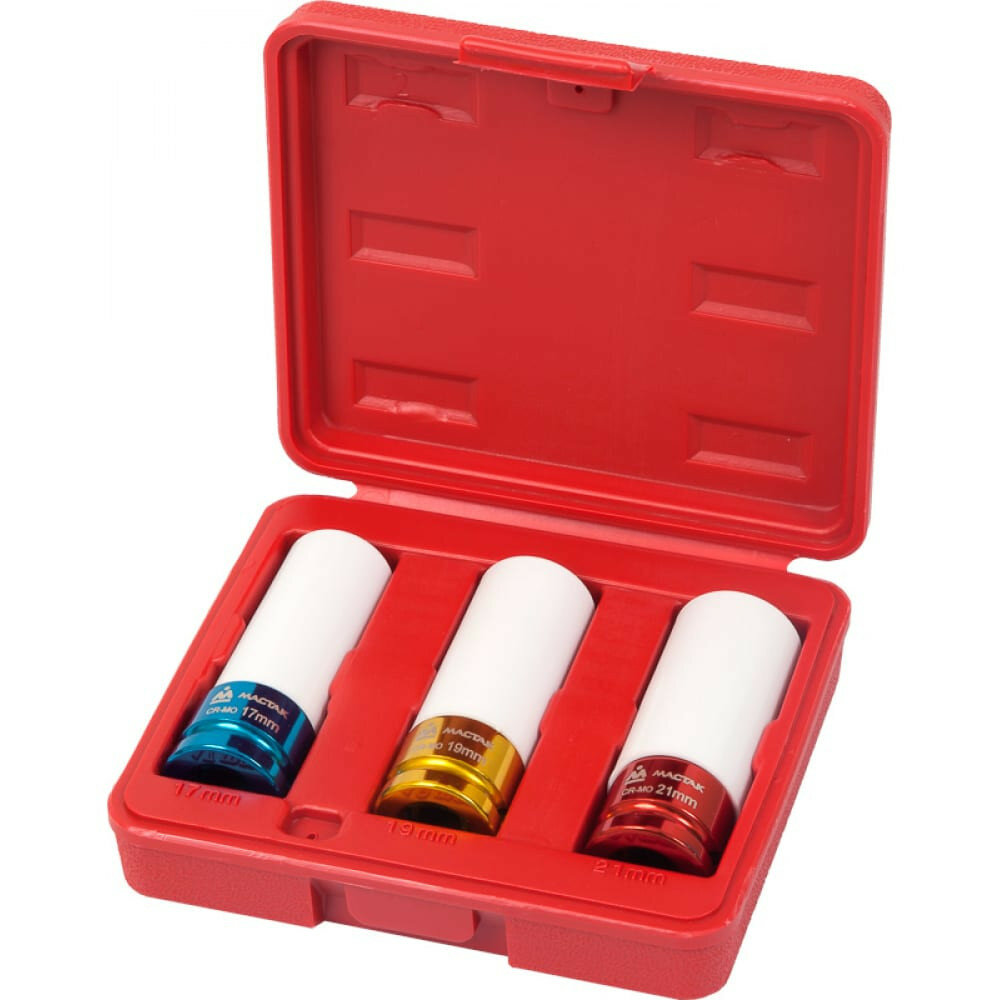 10 цен на Набор ударных глубоких шестигранных головок 1/2", 17, 19, 21 мм, пластиковое покрытие, кейс, мастак 006-43C