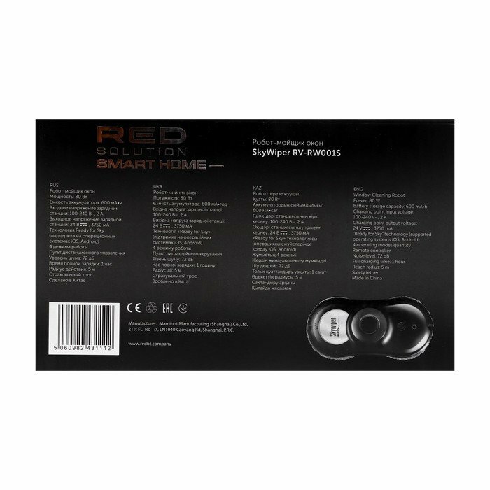 Робот-мойщик окон RED SOLUTION SkyWiper RV-RW001S, 80 Вт, шнур 4 м, зарядка 1 ч, чёрный информация: