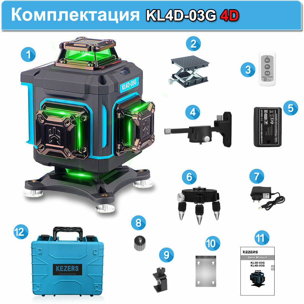 Лазерный уровень/нивелир Kezers KL4D-03G, Зеленый луч 360 4D 16 Линий Чемодан информация: