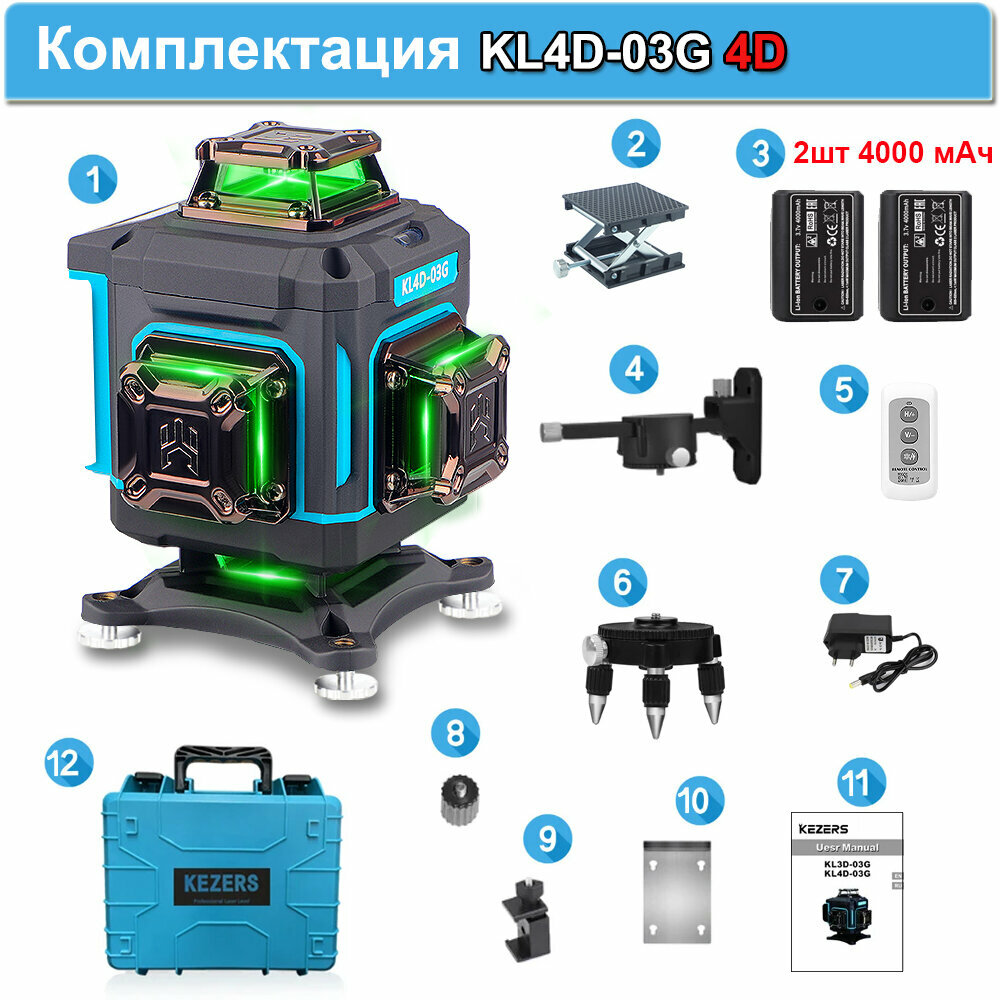 Лазерный уровень Kezers KL4D-03G, Зеленый луч 360 4D 16 Линий, С 2-мя литиевыми батареями емкостью 4000 мАч Чемодан информация: