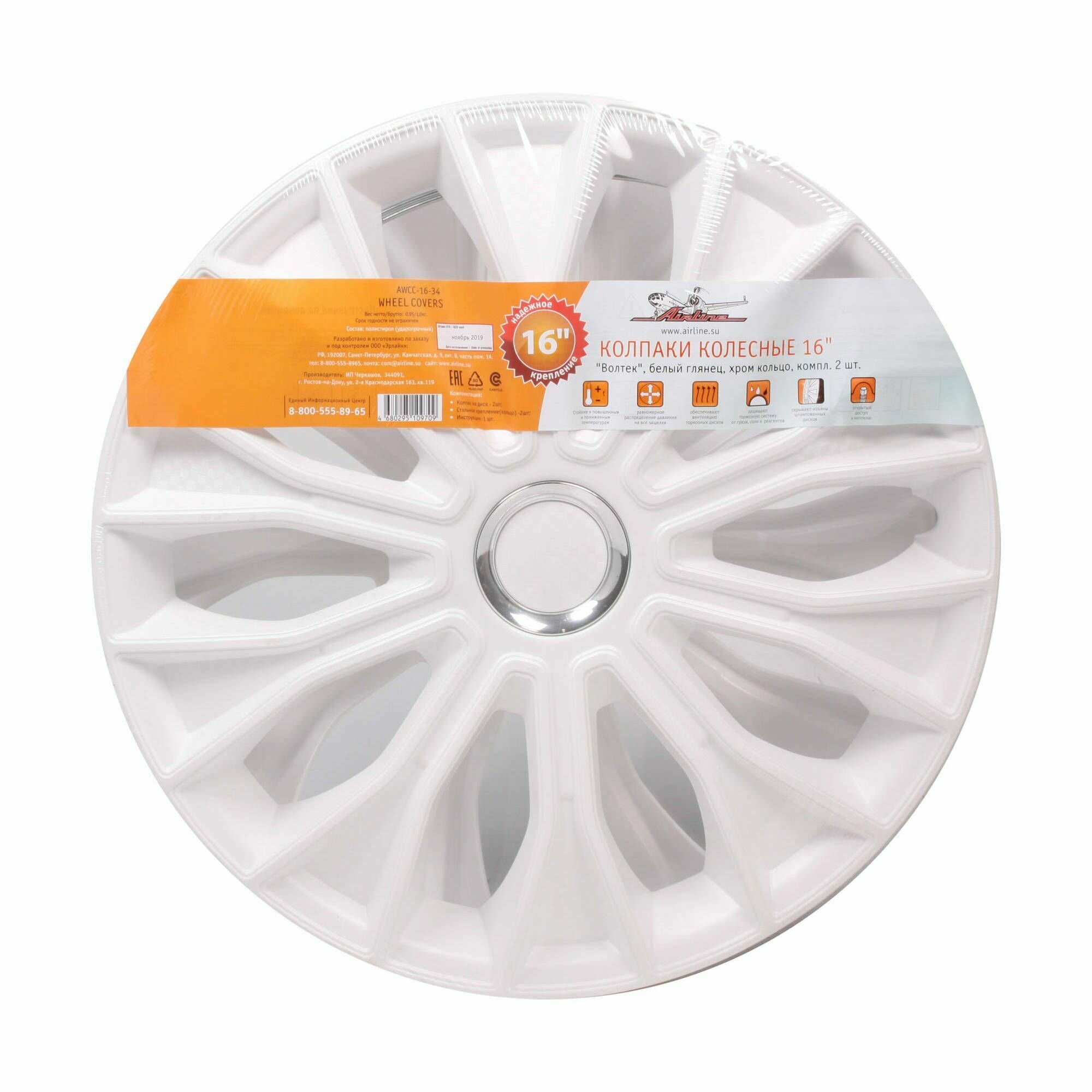 AIRLINE AWCC-16-34 Колпаки колесные 16 Волтек, белый глянец, хром кольцо, компл. 2 шт. (AWCC-16-34)