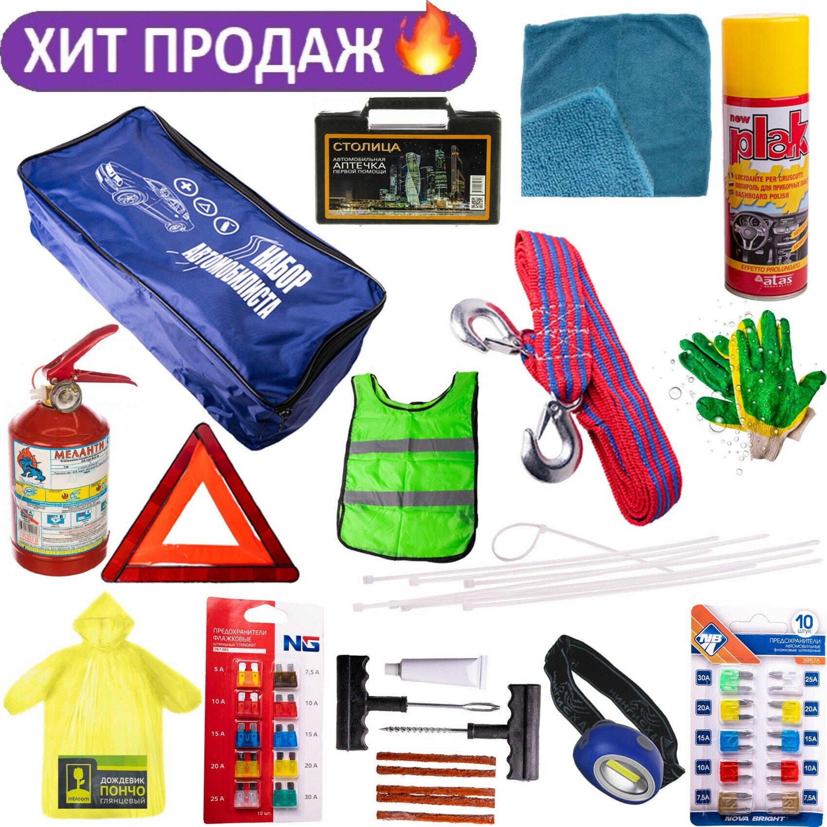 10 цен на Набор автомобилиста С-12. Огнетушитель 1кг, знак аварийный, аптечка, трос лента 5т