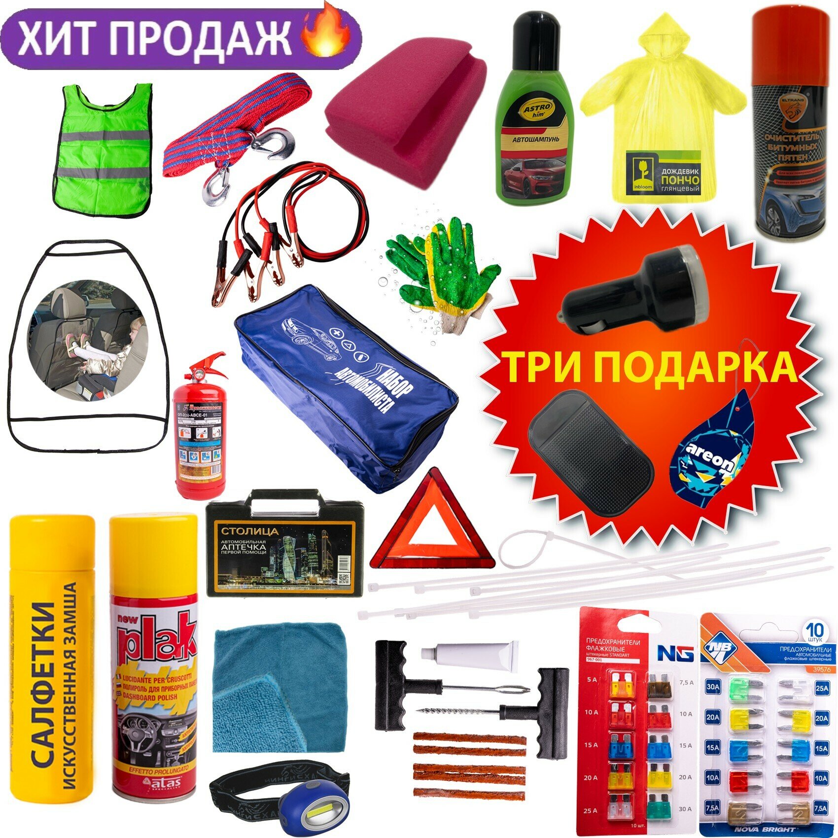 | В наборе | аптечка / дождевик / жилет светоотражающий / знак аварийной остановки / манометр / огнетушитель / перчатки / пусковые провода / трос буксировочный / фонарь |