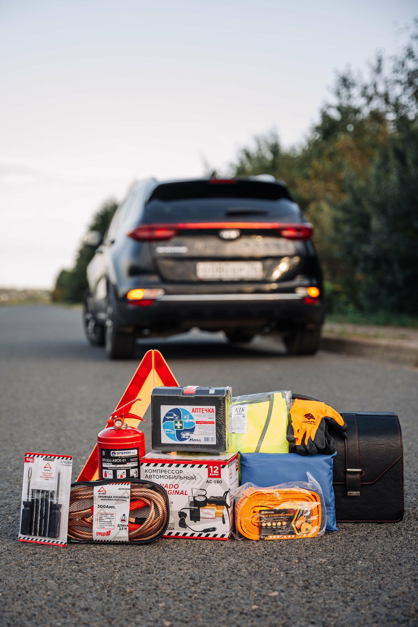 | В наборе | аптечка / дождевик / жилет светоотражающий / знак аварийной остановки / компрессор / огнетушитель / перчатки / пусковые провода / ремкомплект для б/к шин / трос буксировочный |