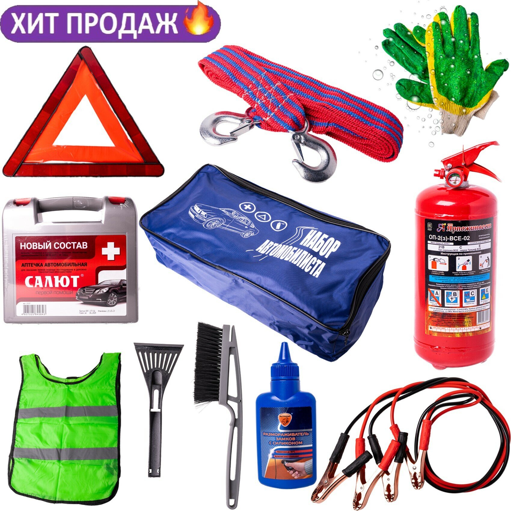 10 цен на Набор автомобилиста N-15 с Огнетушителем (ОП-2), аптечкой (ГОСТ по приказу.), знаком аварийной остановки в пенале, перчатками