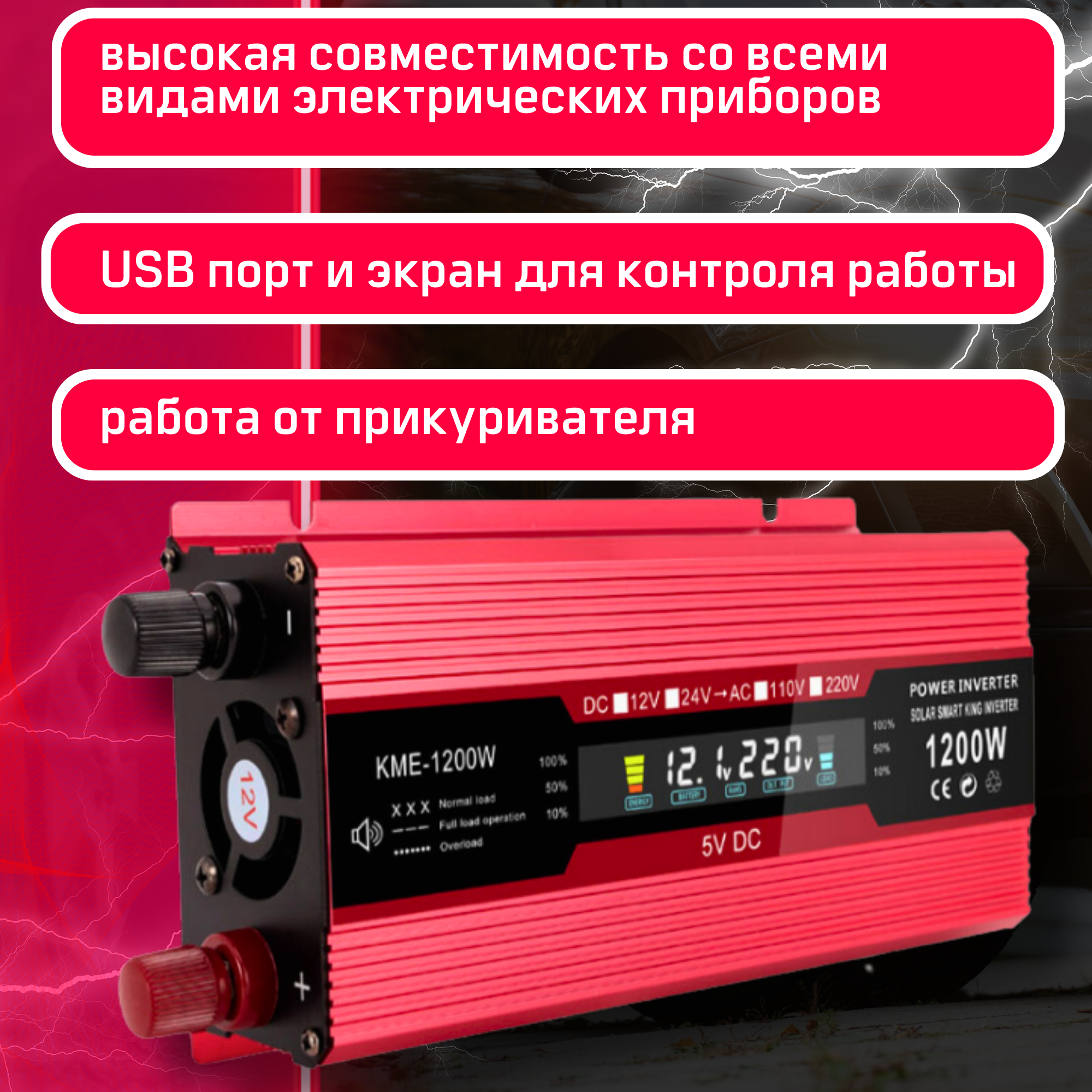 Инвертор автомобильный преобразователь напряжения для автомобиля и электроприборов 1200W 12-220В Контроль заряда АКБ информация: