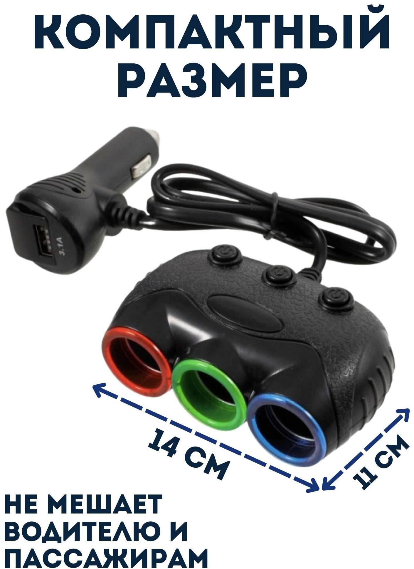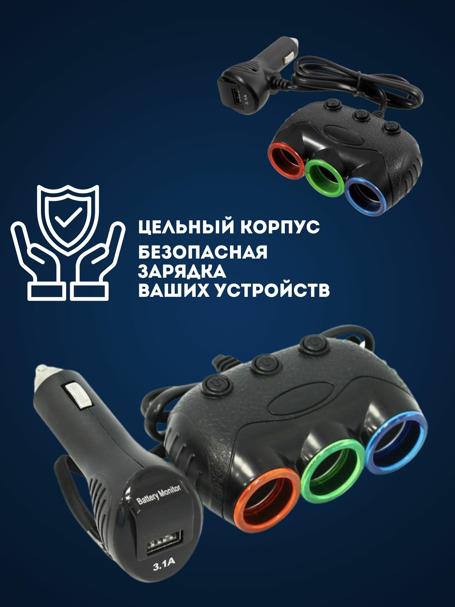 10 цен на Разветвитель прикуривателя 3 гнезда 120W + 2хUSB разъемa 5V-2.1А, 1А, с выключателем 12/24V