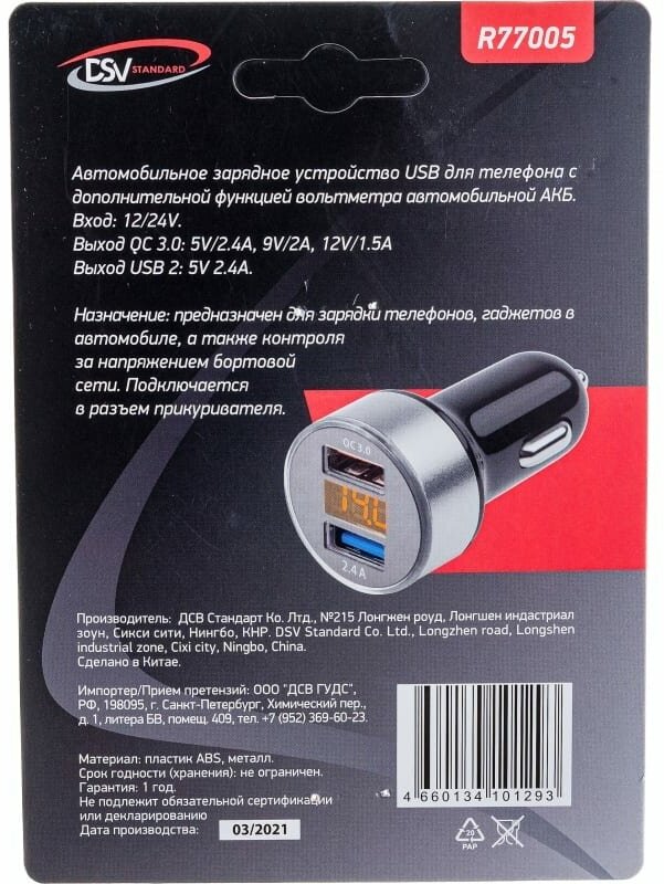 Разветвитель прикуривателя 1 гнездо+USB с вольметром DSV R77005 информация: