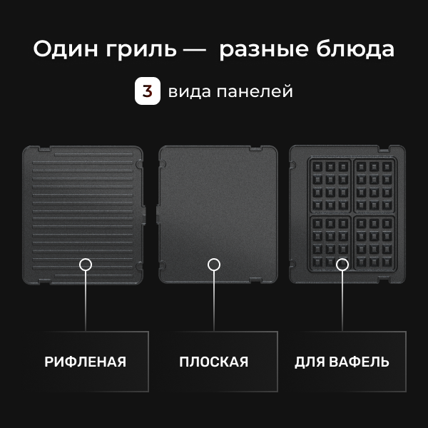 | Дополнительная информация | 10 встроенных автопрограмм, термощуп и форма для котлет в комплекте, индивидуальный нагрев панелей, 3 вида панелей в комплекте, легкая очистка панелей с технологией Easy Clean |