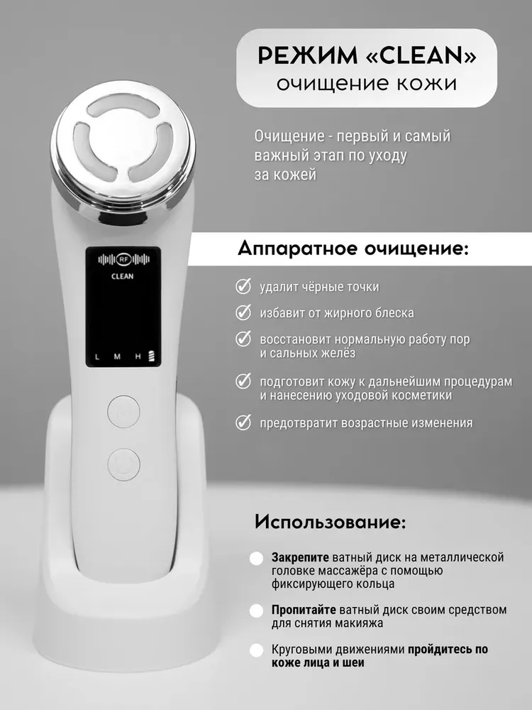 | Дополнительная информация | Режим увлажнения Moisturizing: интенсивное питание и увлажнение кожи. Способствует эффективному проникновению косметических средств в глубокие слои дермы. Сделает кожу напитанной, увлажненной, эластичной и сияющей. Режим синтез коллагена Col Synthesis РФ rf лифтинг: способствует природной выработки коллагена и эластина, подтягивает вялые мышцы лица и тела, борется с признаками старения. Вибрационный массаж стимулирует кровообращение и улучшает внешний вид кожи. Хромотерапия (светолечение) убивает вредные бактерии, способствует циркуляции крови, вызывает противовоспалительное, бактерицидное действие, эффективно удаляет прыщи, борется с проблемами постакне. Косметические средства(косметика,уход) для использования аппарата: токопроводящий гель, маска для лица, гель, сыворотка, крем. Косметический массажер для лица и тела подходит для молодой и зрелой кожи. |