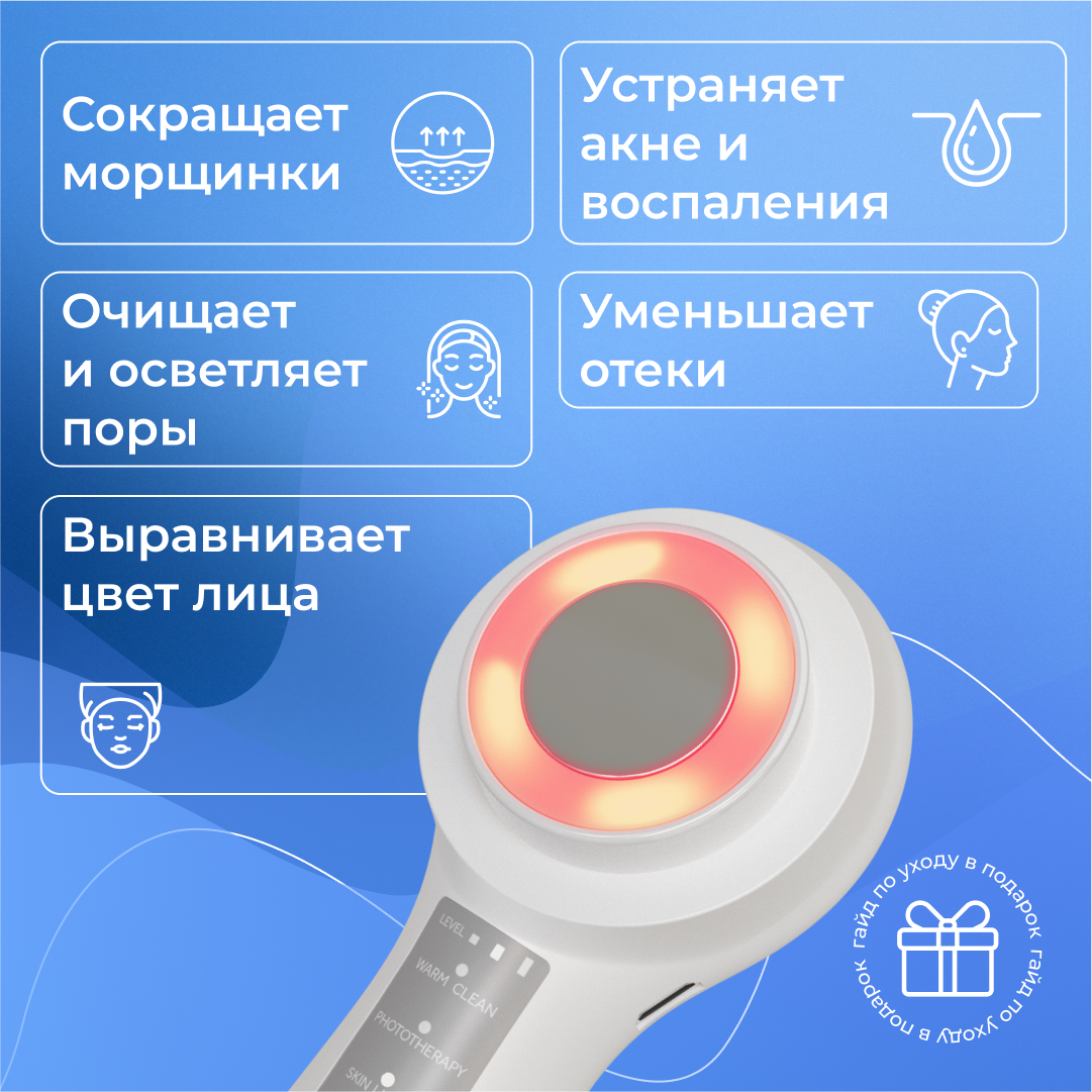 | Принцип работы | RF-лифтинг / вибрация / микротоки / пилинг / светотерапия / ультразвук / фонофорез |