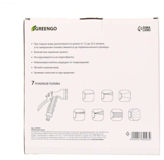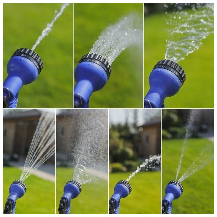 Чудо-шланг, латекс, L = 7,5–22,5 м, 2-слойный, нейлоновая оплётка, распылитель 7 режимов, штуцер 12 мм (1/2"), 19 мм (3/4")