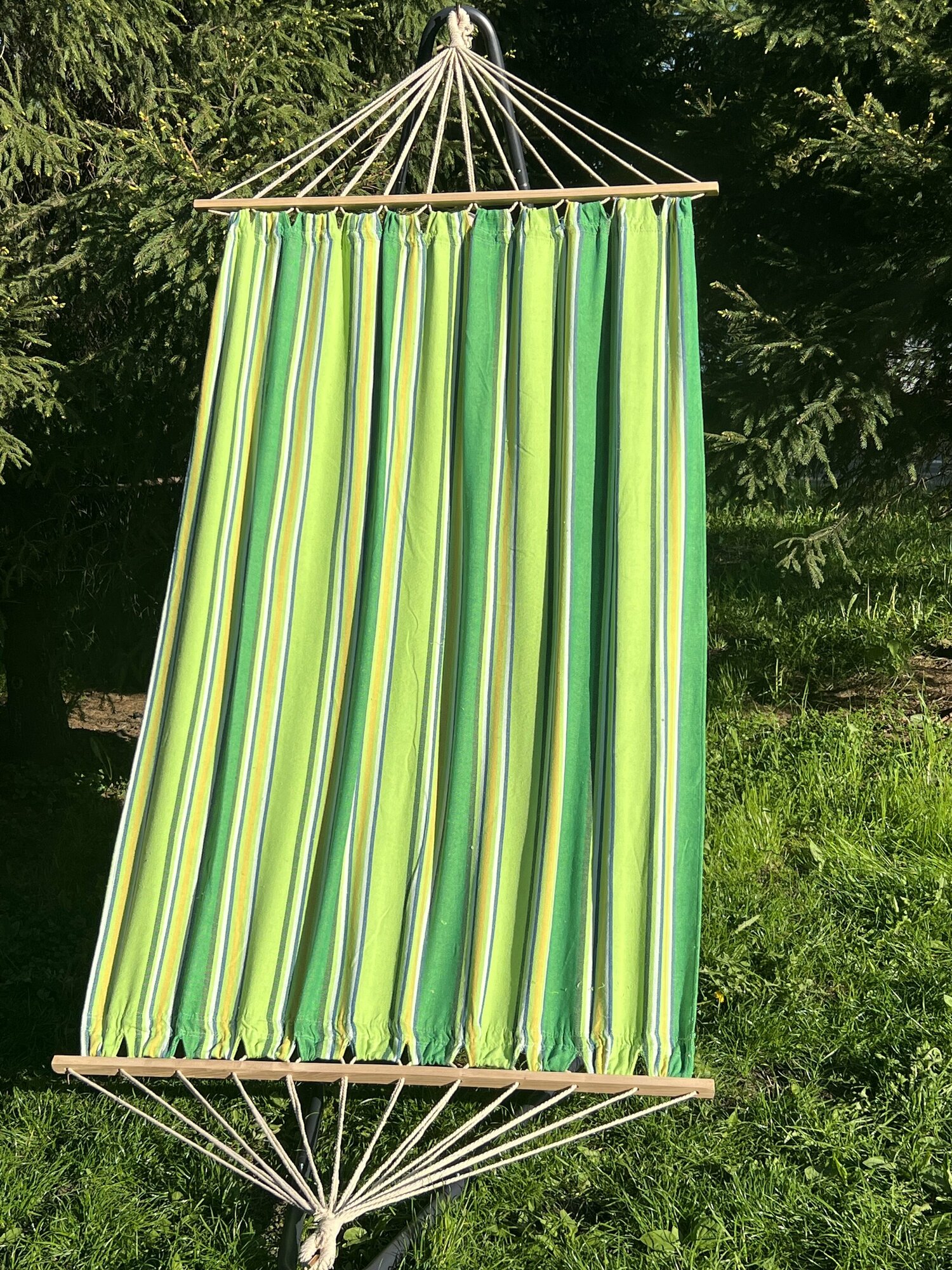 Отзывы на Гамак, 145*200/280см, полотняный, хлопок, общая длина 280 см, зеленый,желтый, белый полоски, до 200кг