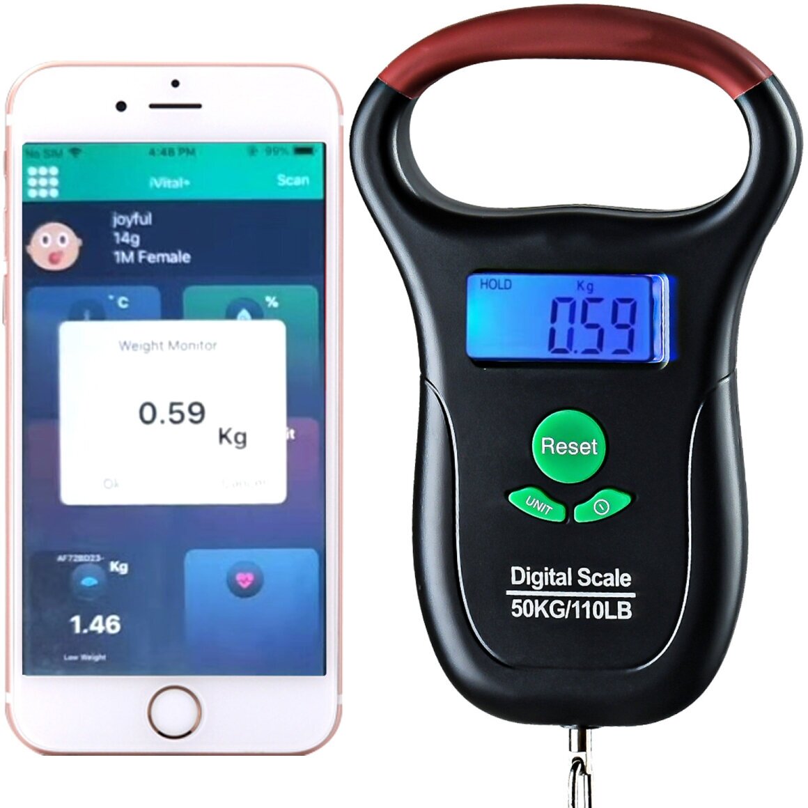 Ручные электронные весы-безмен для багажа до 50 кг с функцией термометра + зеленая подсветка