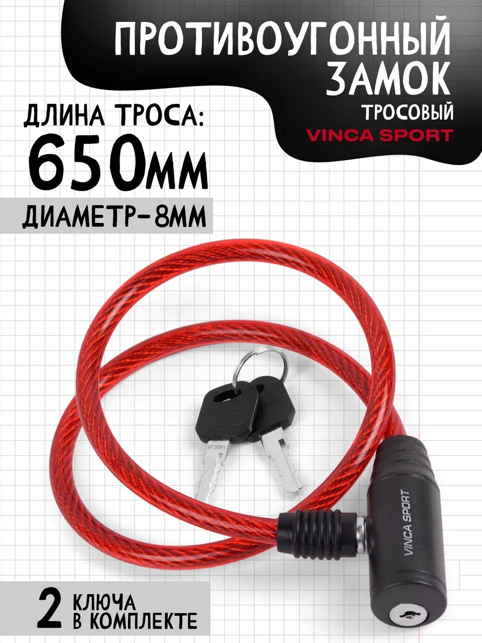 VS 101.101 red. Замок велосипедный 8*650мм, красный тросик. инд.уп. Vinca Sport 394 ₽