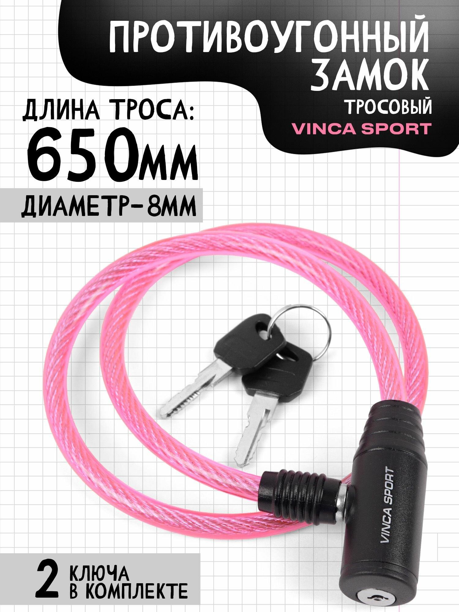 VS 101.101 black. Замок велосипедный 8*650мм, чёрный тросик. инд.уп. Vinca Sport