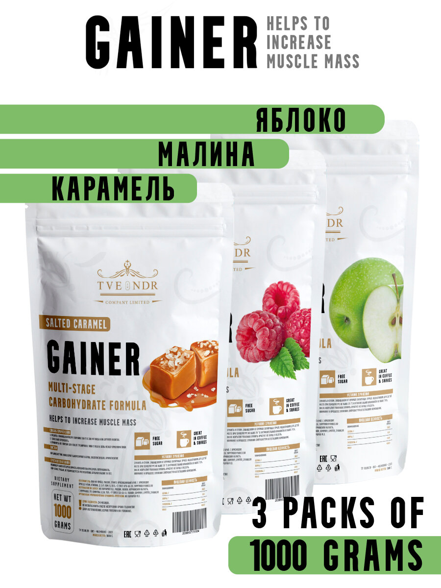 Набор гейнера от TVENDR Compani Limited из 3-ёх вкусов карамель, малина, яблоко информация: