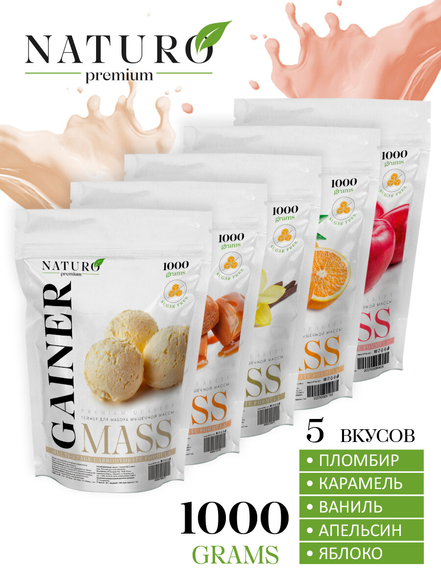 Набор гейнера от NATURO Premium из 5 вкусов пломбир, карамель, ваниль, апельсин, яблоко информация: