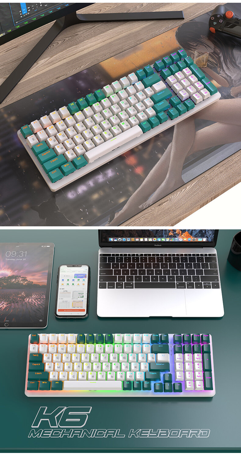 Игровая RGB беспроводная механическая клавиатура K6 Bluetooth, Серый/Зеленый информация: