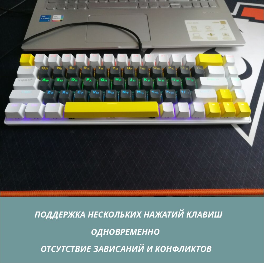 Отзывы на бело-жёлтая механическая клавиатура игровая Q68 RGB + комплект чёрных русско-английских PBT кейкапов