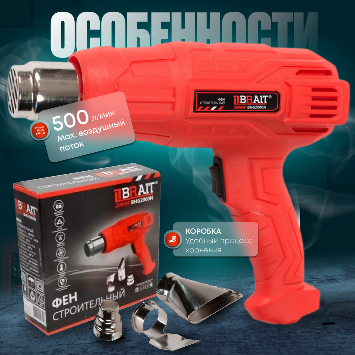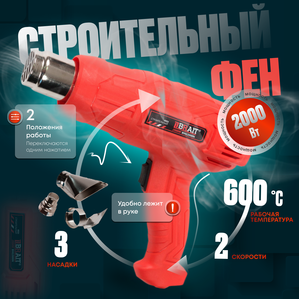 Фен строительный BRAIT BHG2000МR (2000Вт, макс.темп. 600С, 3 насадок, 2 скорости, регул, )