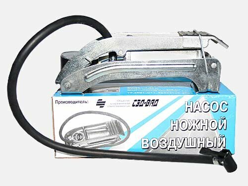 | Дополнительная информация | Насос ножной воздушный. Легковые автомобили. Объем цилиндра - не менее 340 см3. Давление создаваемое насосом - не более 3х кгс/см2 . Длина шланга - 650:750 мм. Температурный интервал работы - -25 ...+45С. |