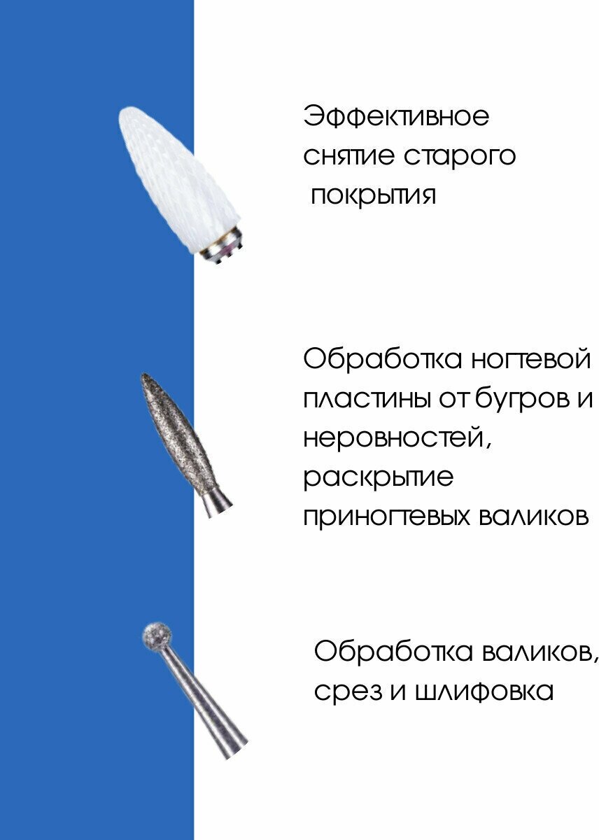 Отзывы на Kaaraanly, Набор фрез алмазных для аппаратного маникюра, педикюра 4 шт. с синей насечкой / пламя / шар / свеча/ керамическая кукуруза + подарок