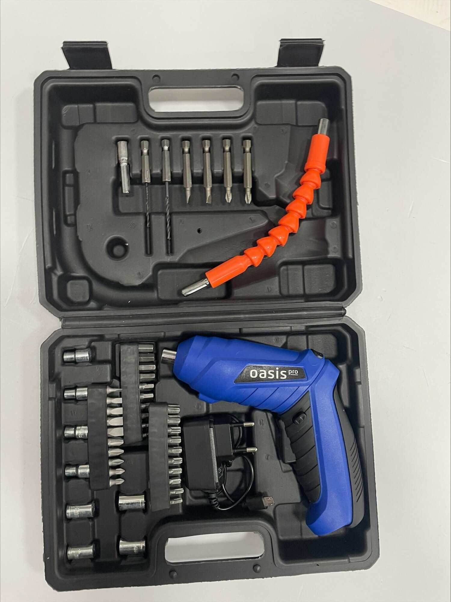 | Комплектация | Аккумуляторная отвёртка – 1 шт. Зарядное устройство – 1 шт. Длинный адаптер – 1 шт. Адаптер патрона – 1 шт. Адаптеры – 8 шт. 25 мм биты – 28 шт. 50 мм биты – 4 шт. Свёрла с держателем – 2 шт. Кейс c оснасткой - 1 шт. Инструкиця по эксплуатации – 1 шт. |