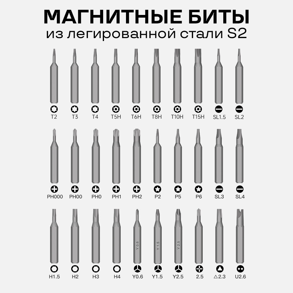 | Комплектация | отвертка, 30 бит, кейс,зарядный кабель,инструменты для вскрытия 2шт,скрепка для сим-карты,устройство для намагничивания и размагничивания комплектных бит |