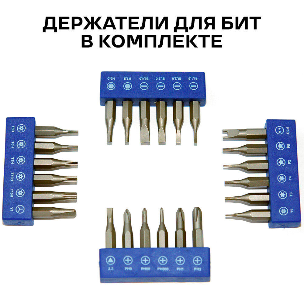 | Комплектация | отвертка, 24 биты, кейс,зарядный кабель,инструмент для вскрытия,держатели для бит 4шт,устройство для намагничивания и размагничивания комплектных бит |