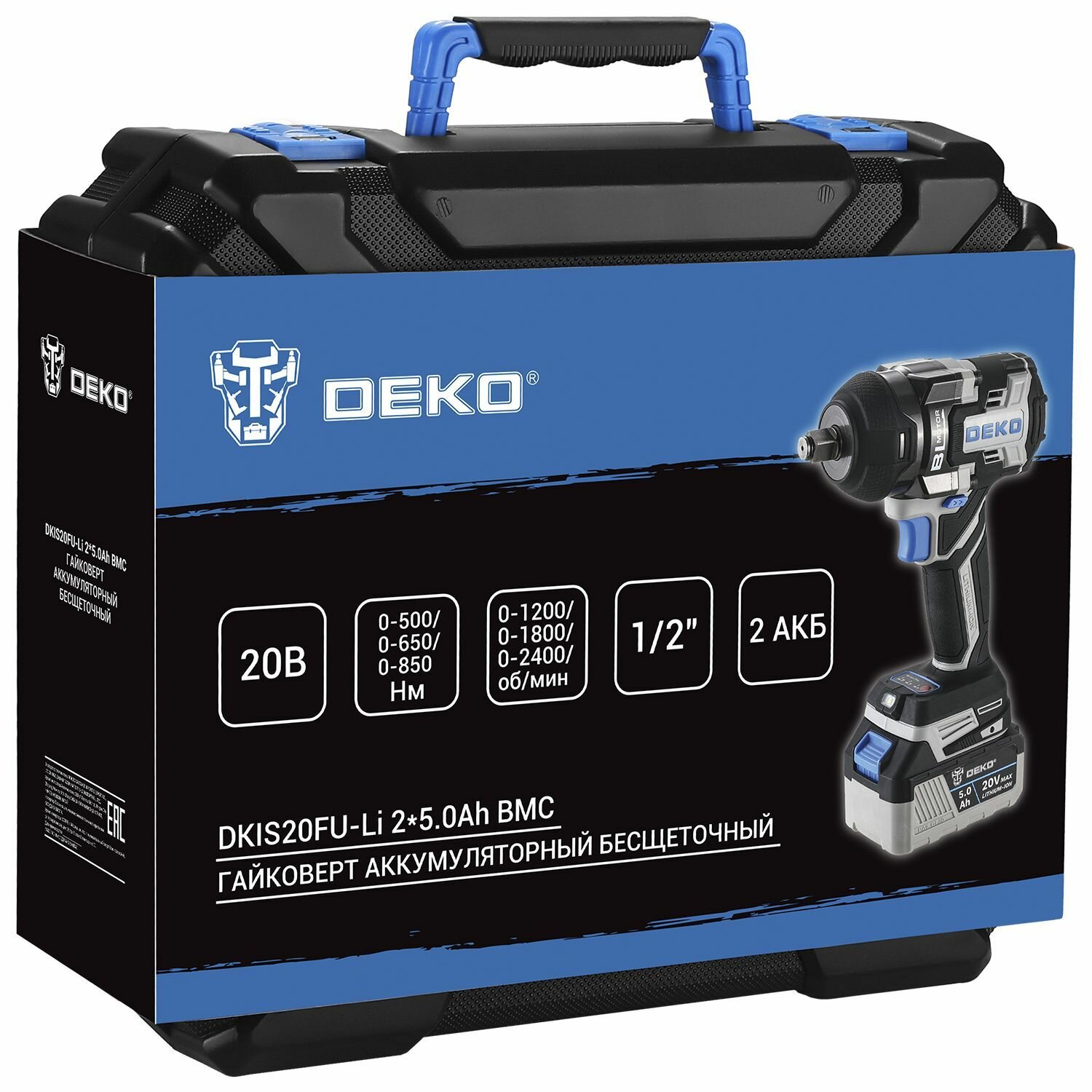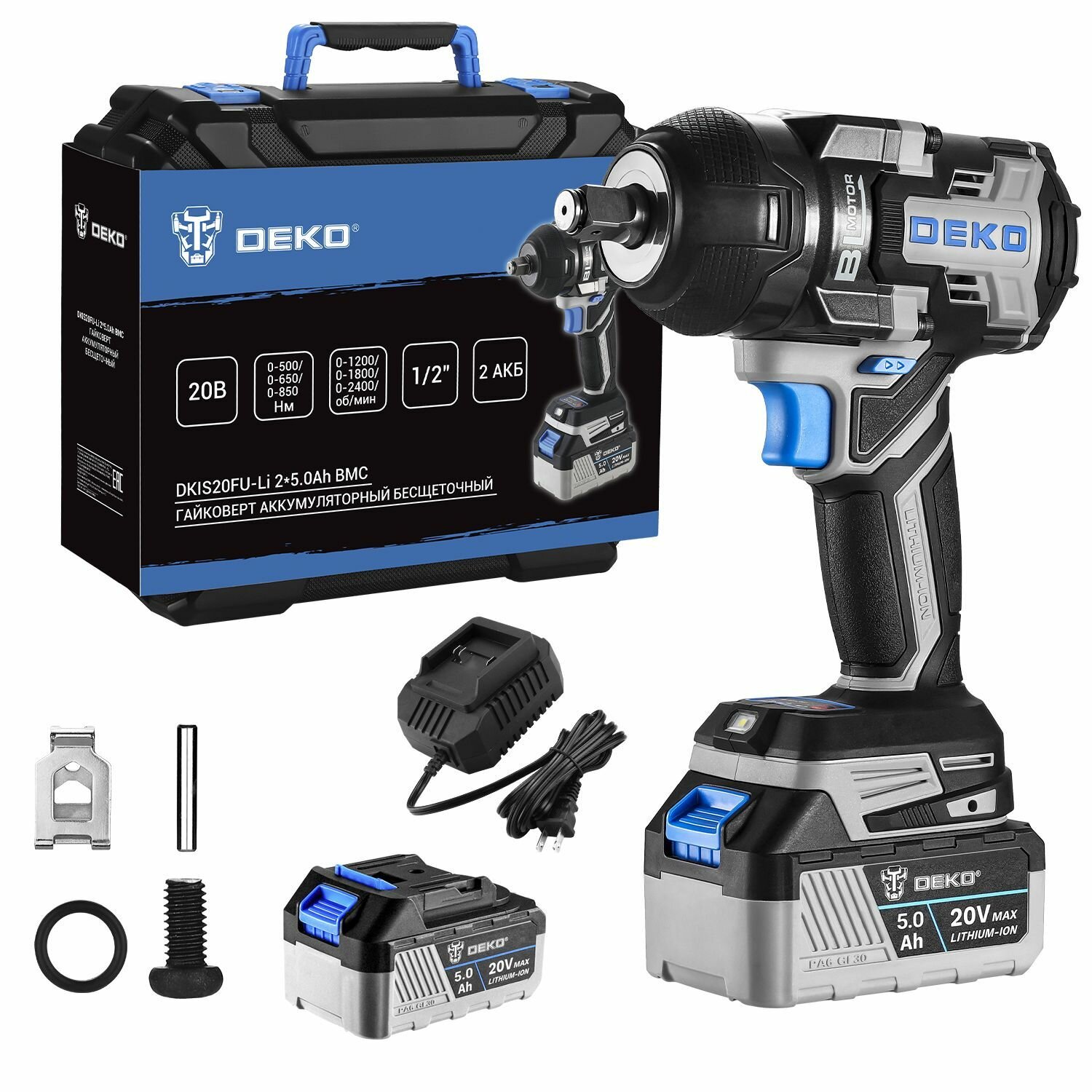 Гайковерт аккумуляторный бесщеточный DEKO DKIS20FU-Li, 20В, 2*5.0Ач, 850 Нм, в кейсе
