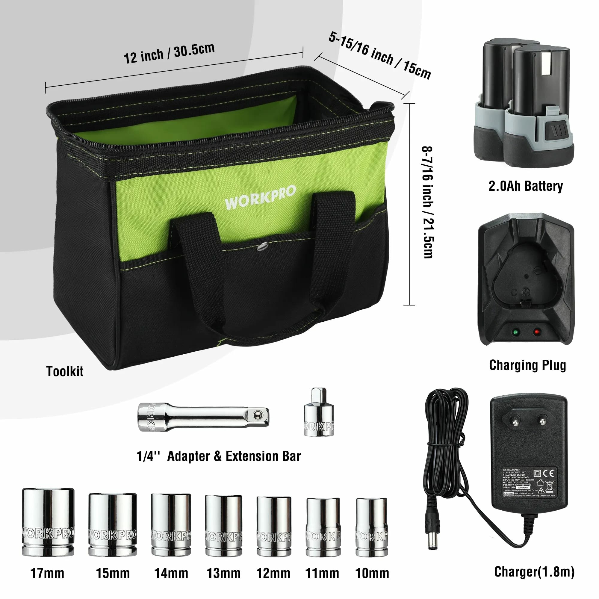 | Комплектация | Угловой гайковерт-1шт., аккумуляторная батарея 12V 2Amh-2шт., торцевые головки-7шт., адаптер и удлинитель 1/4дюйма-2шт., зарядное устройство-1шт., сумка -1шт. |