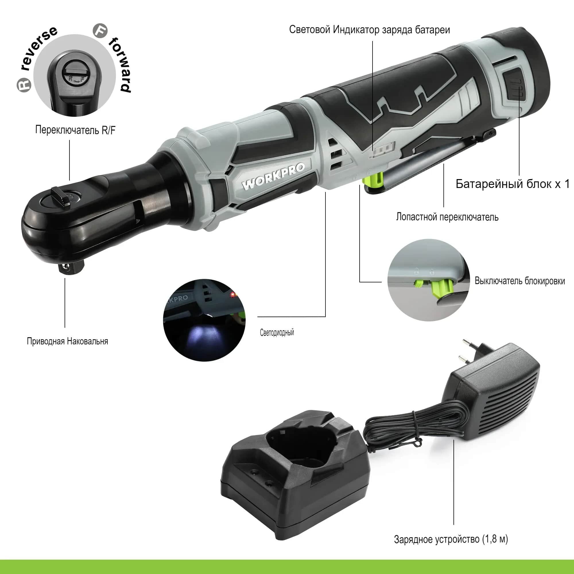 Аккумуляторный угловой гайковерт Workpro с двумя аккумуляторами 12В, 2Ач информация: