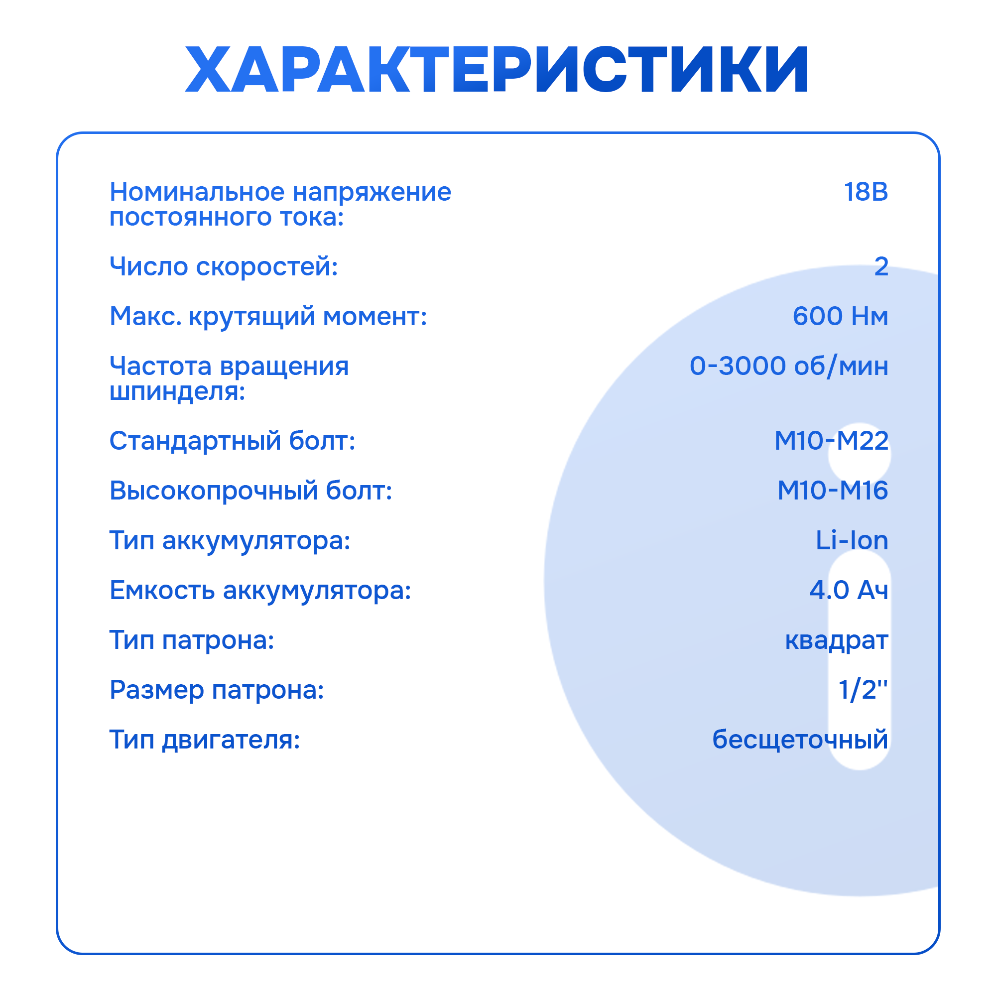 Гайковерт бесщеточный аккумуляторный ударный Vniissok V18-BQ (600 Nm) информация: