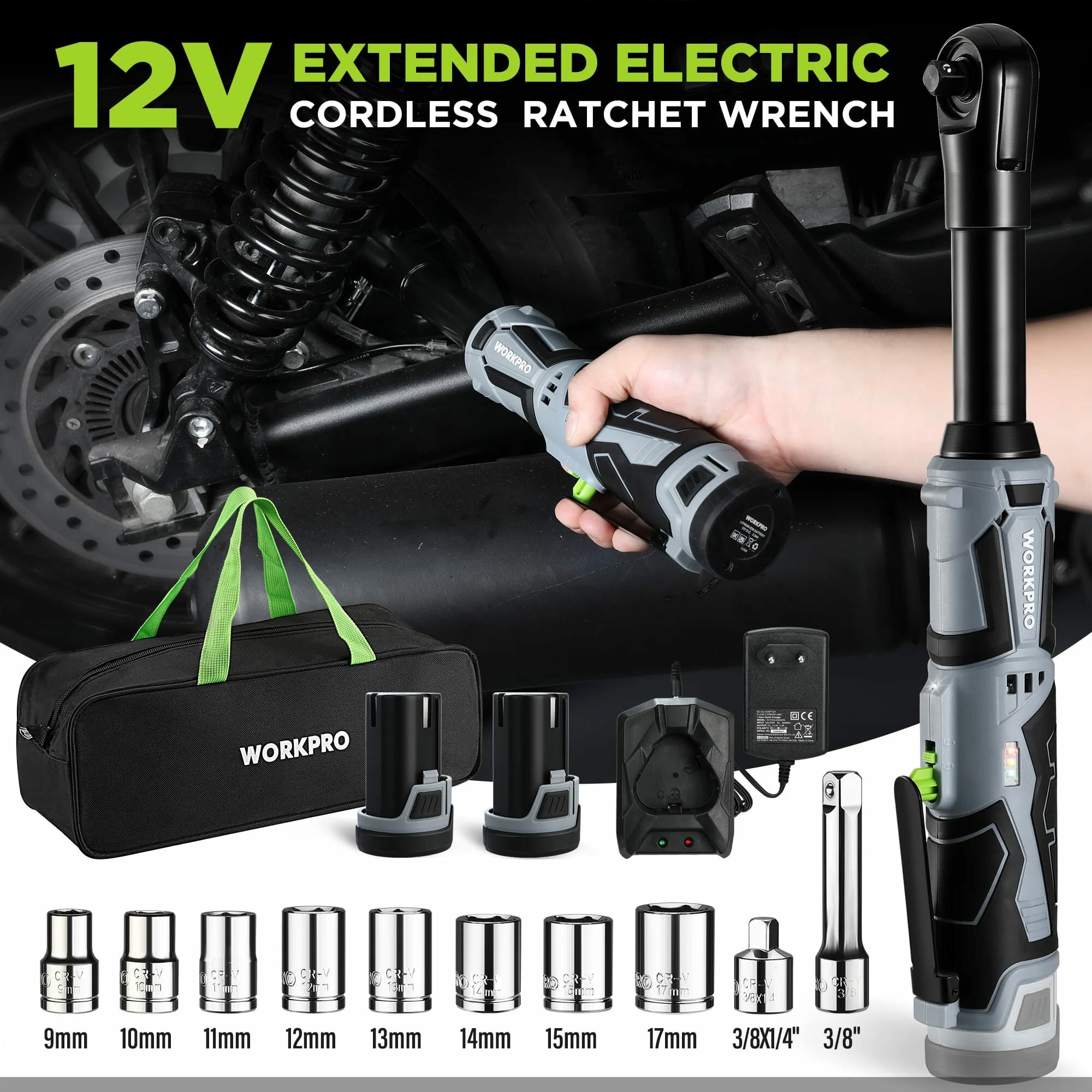 10 цен на Аккумуляторный угловой гайковерт Workpro с удлиненной головкой, с двумя аккумуляторами 12В, 2Ач, с храповым механизмом