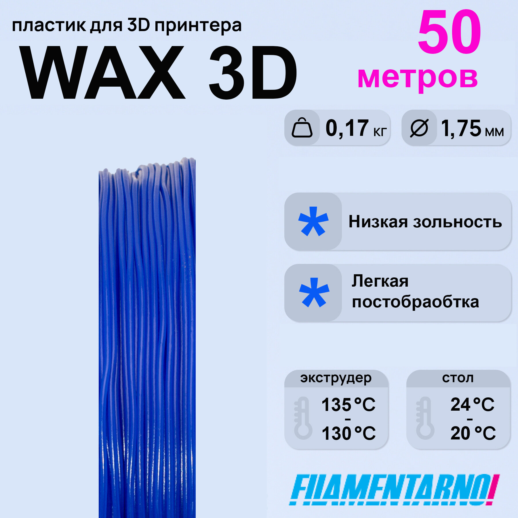 Воск WAX3D синий моток 50 м, 1,75 мм, пластик Filamentarno для 3D-принтера информация: