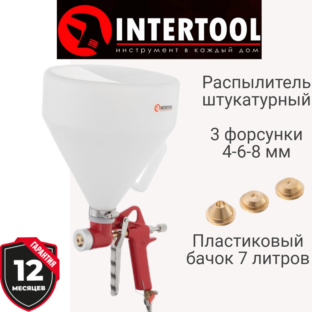 Отзывы на Распылитель штукатурный пневматический, три форсунки 4;6;8мм, В/Б пластмассовый, 7000мл, 3-6 атм INTERTOOL PT-0402