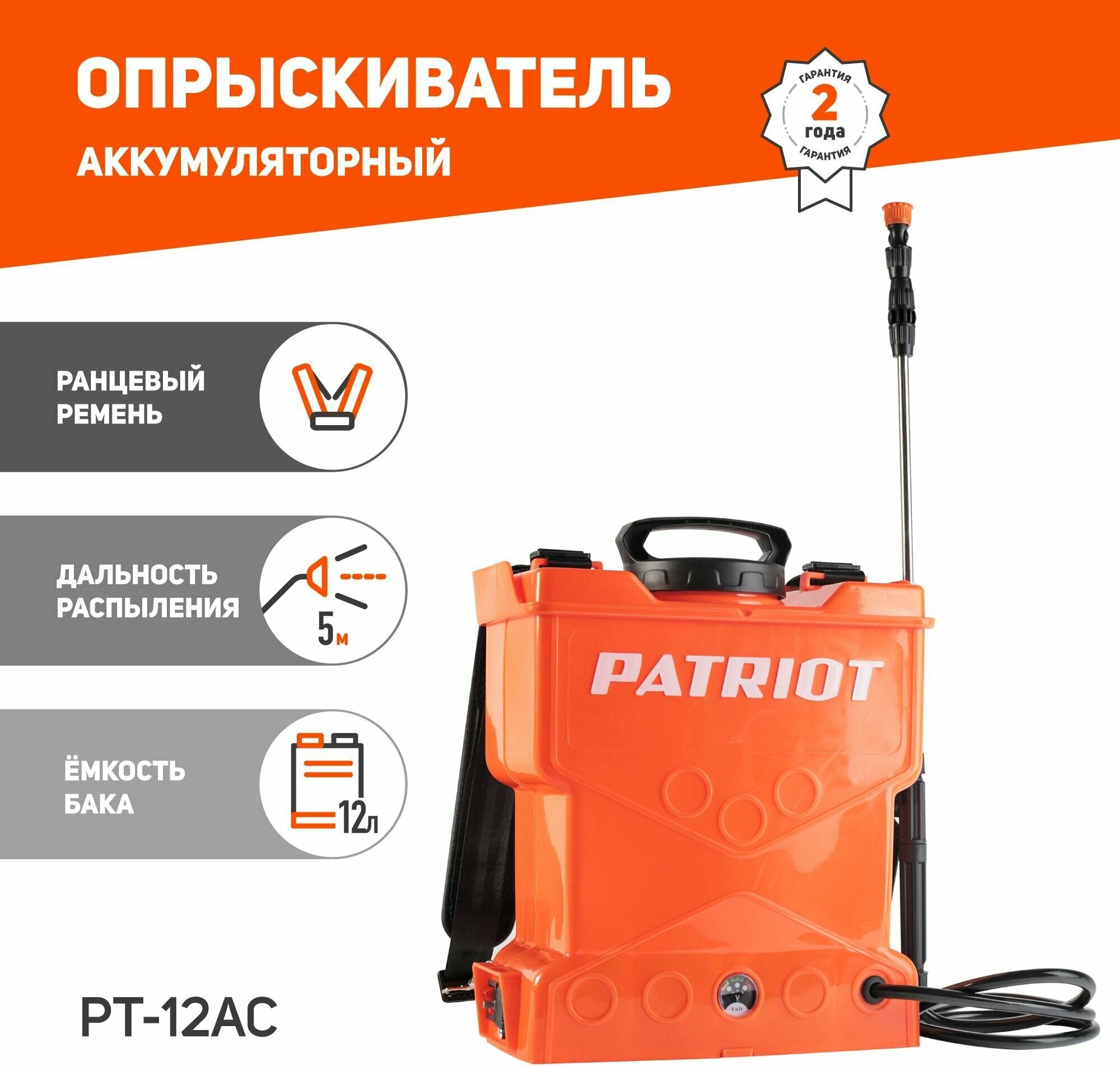Опрыскиватель аккумуляторный ранцевый PATRIOT PT-12 АС, 12 л, 12 В, 3,1 л/мин, 8 А*ч, 3 насадки, распылитель, ЗУ, ранцевое крепление в комплекте 5 055 ₽