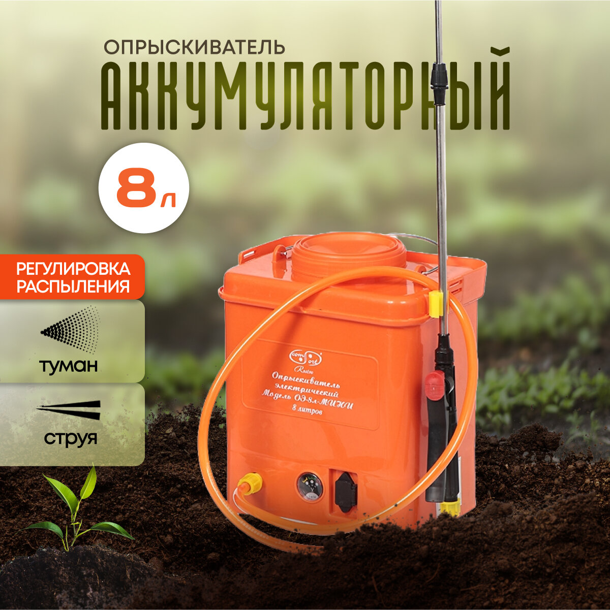 Опрыскиватель садовый работа от аккумулятора, Comfort, 8 л, 12 А.ч, 6 В, телескопическая штанга, ОЭ-8 информация: