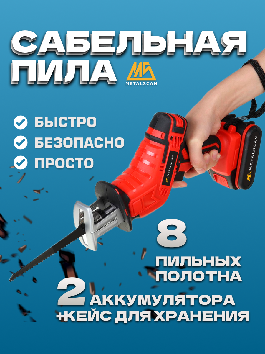 | Комплект поставки | Сабельная пила, острые пильные полотна, 8 штук, зарядный адаптер питания для батареи, литиевая батарея 2шт, удобный пластиковый кейс - футляр, инструкция на русском языке |
