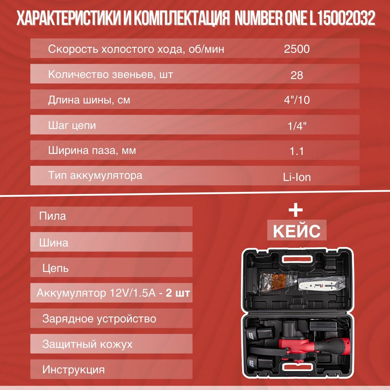 Пила цепная аккумуляторная мини Number One L15002032, 2 аккумулятора, з/у Кейс+Подарок шина и цепь информация: