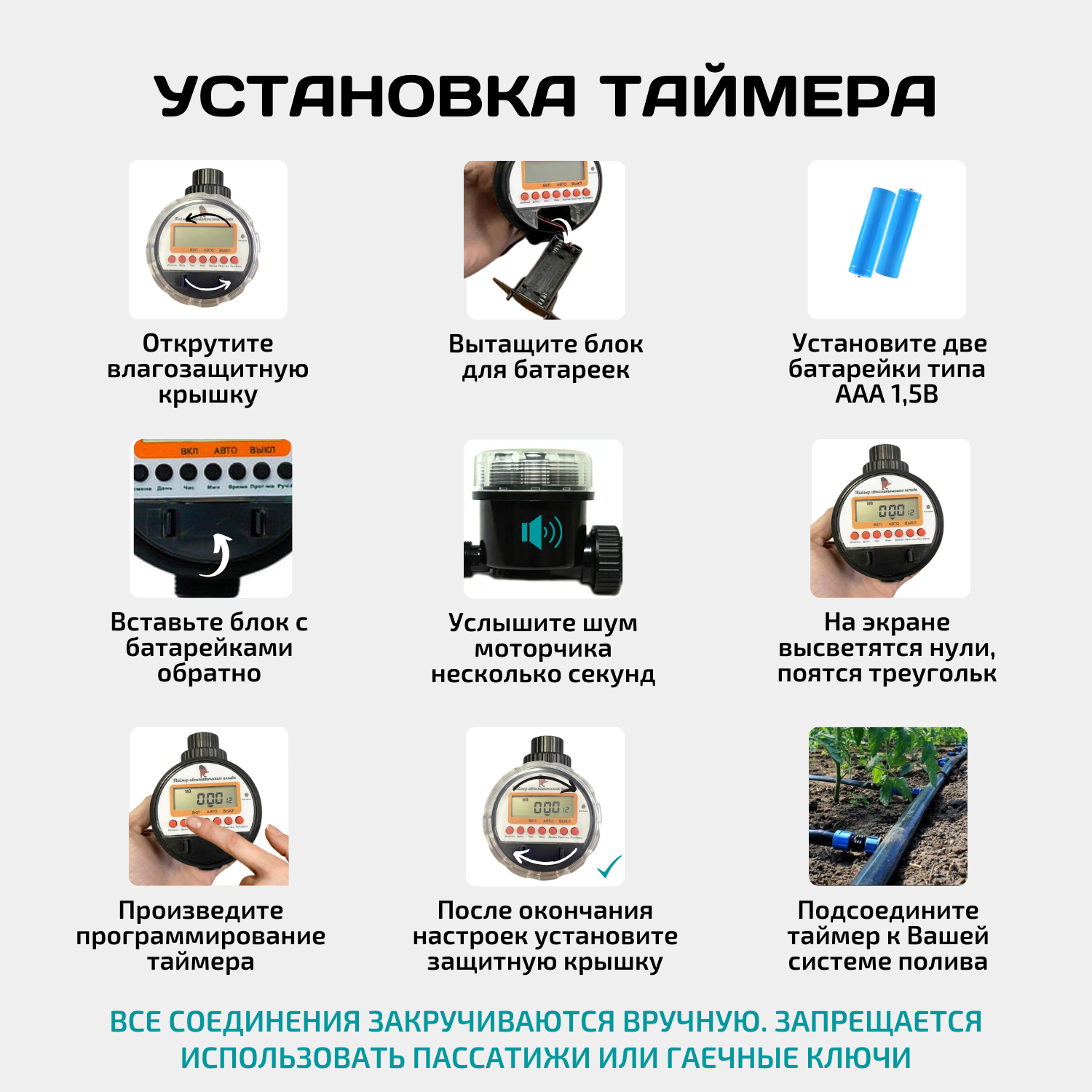 | Дополнительная информация | таймер контроля подачи воды шаровый работает от 2 батареек ААА 1,5В (в комплект не входят) |