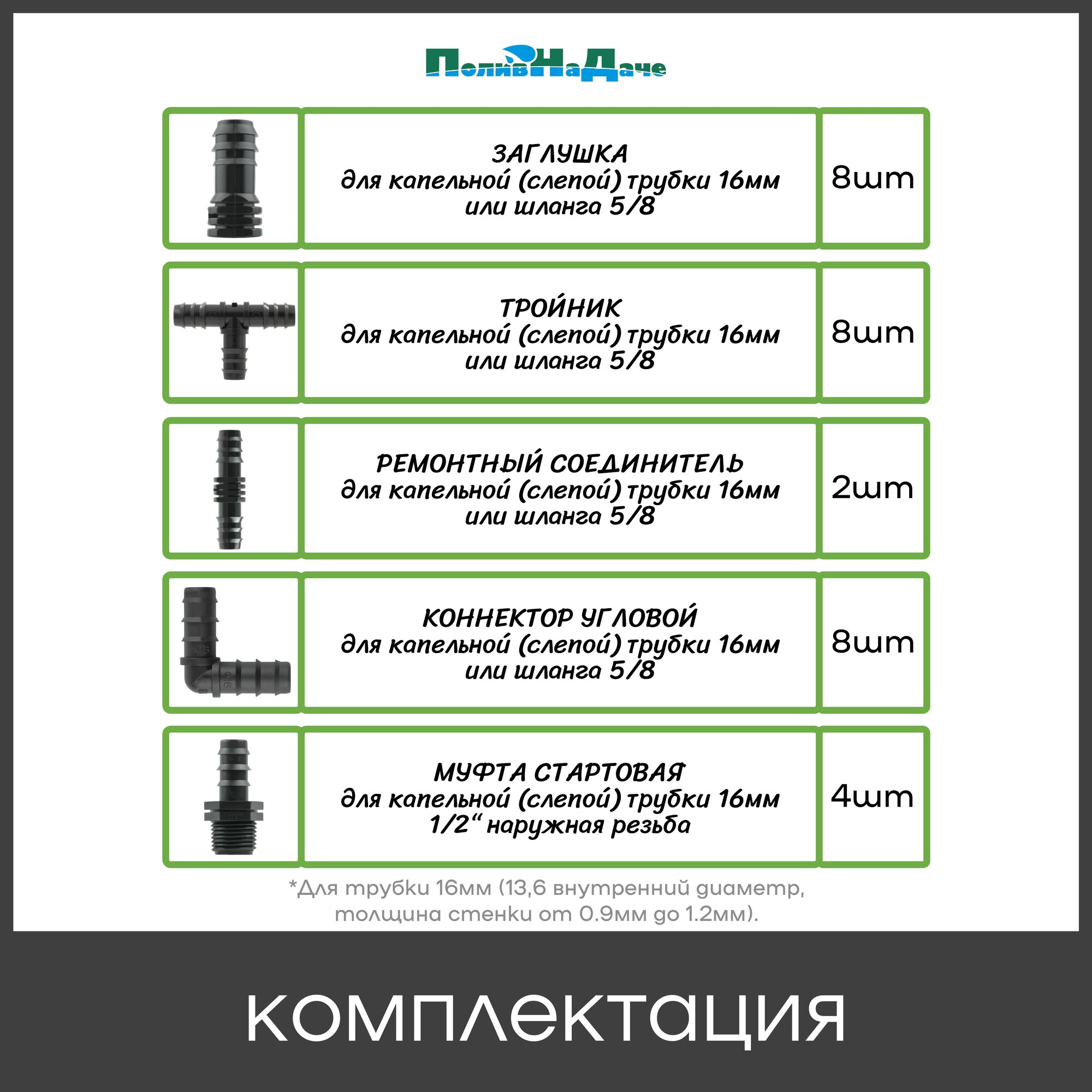 Комплект фитингов для трубки 16мм. Набор включает в себя 30 предметов для систем капельного орошения. информация: